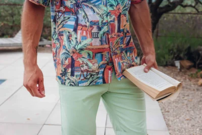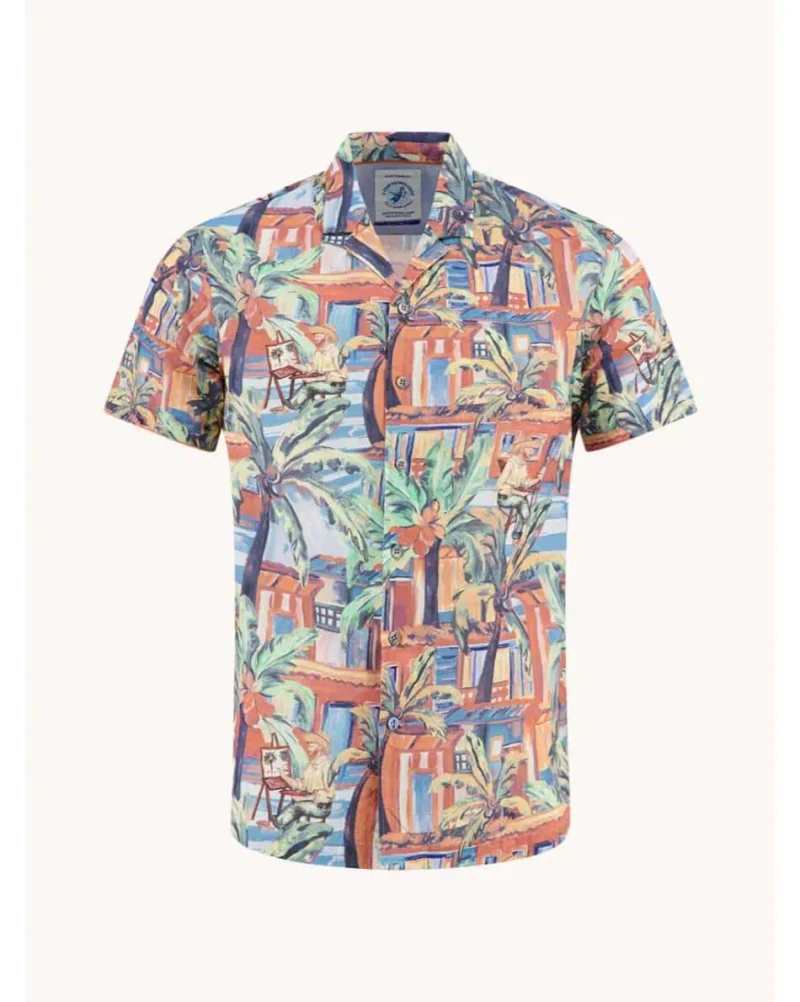 The short sleeve Tropical Sketch shirt by A fish named Fred is a wearable vacation. Covered in a vivid hand-painted print of palm trees, artist scenes and island buildings, this shirt feels like a visual travel diary of summer adventures.