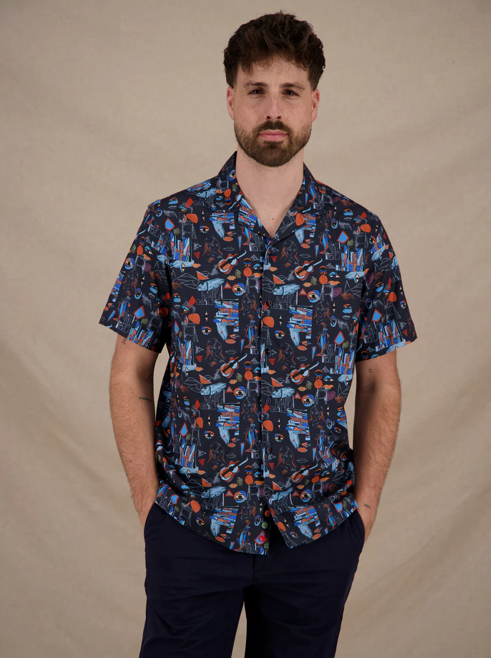 Featuring an all-over cubist print of vibrant faces, shapes, and urban motifs, this shirt brings modern art to your wardrobe. Lyocell / Cotton blend