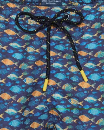 Introducing the Navy Fish Print Swimshorts from A Fish Named Fred – the perfect blend of comfort and style for your summer adventures. Designed for those who appreciate a touch of personality in their swimwear, these shorts feature a charming fish print on a deep navy background, making them a standout choice for beach outings, pool parties, or simply lounging by the water.