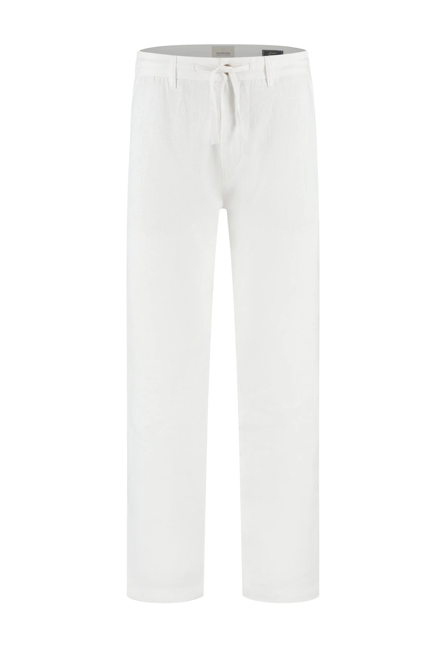 Dstrezzed 100% crispy linen white Beach Pant. It has a loose tapered fit and relaxed style with a partly elastic waistband and cord.