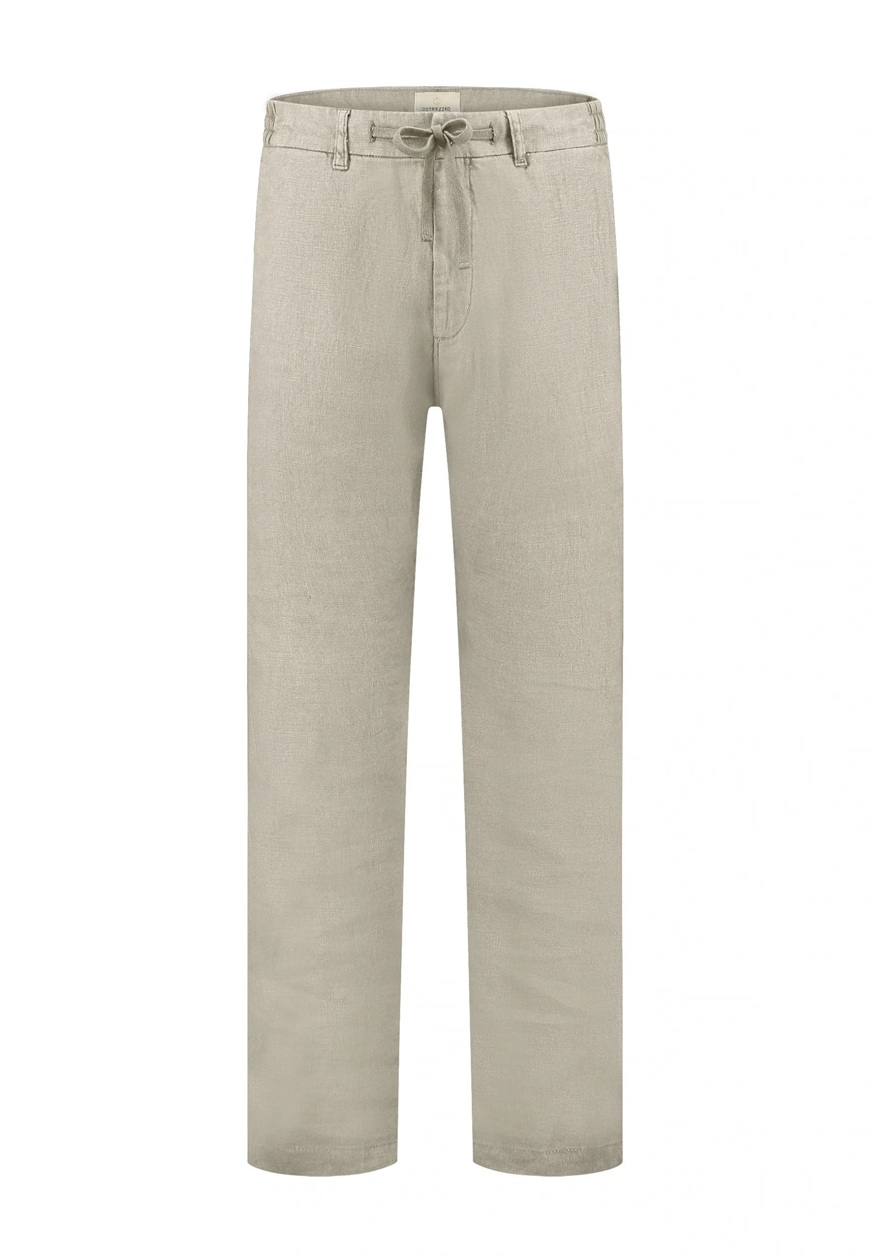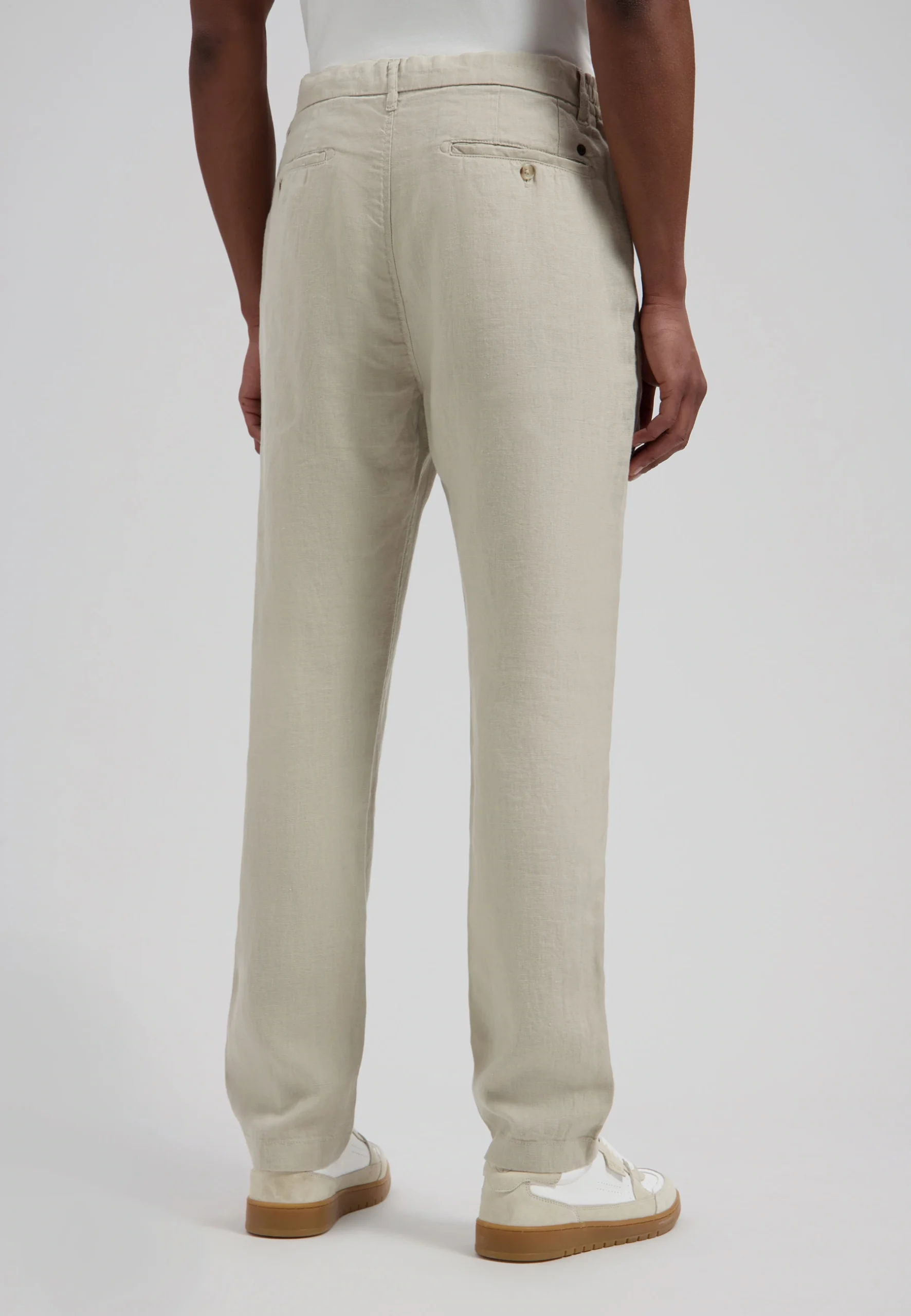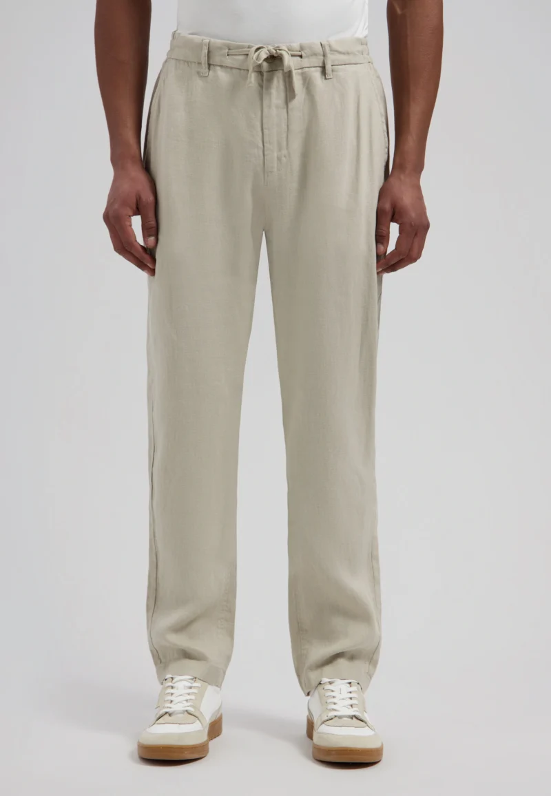 A wardrobe essential: Dstrezzed 100% crispy linen James Beach Pant. It has a loose tapered fit and relaxed style with a partly elastic waistband and cord.