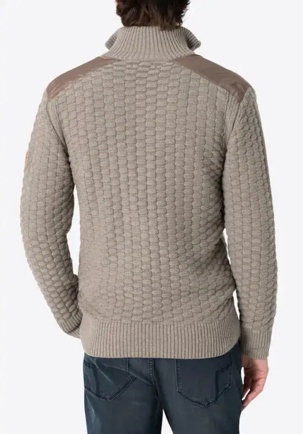 Robust knitted sweater made of a high-quality cotton-polyacrylic mix. The model has a striking checkerboard knit pattern in 3D look, a full zip, classic ribbed sleeve and hem cuffs and a French shoulder finish.