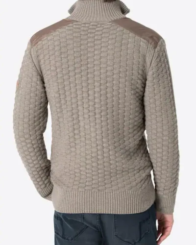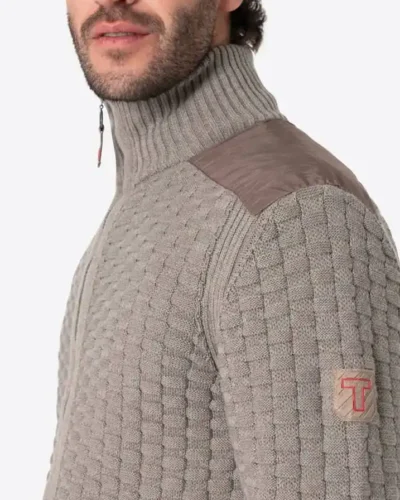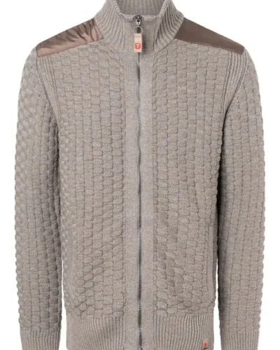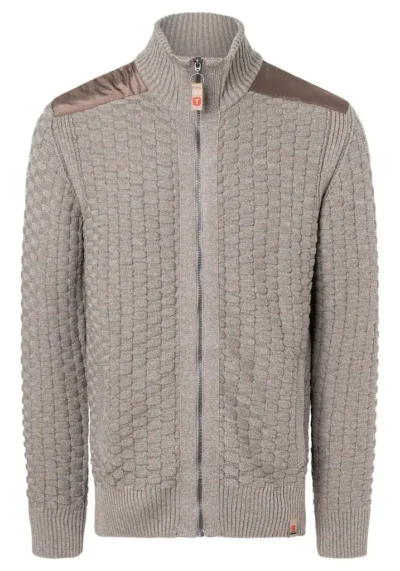 Robust knitted sweater made of a high-quality cotton-polyacrylic mix. The model has a striking checkerboard knit pattern in 3D look, a full zip, classic ribbed sleeve and hem cuffs and a French shoulder finish.
