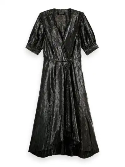 With an eye-catching shining silver coloration, our latest midi-length dress comes with short sleeves and a wrapped V-neck. With a slightly puffed shoulder, this dress is the perfect statement piece for any collection. Discover the exquisite allure of our Silver Short-Sleeved Midi Dress, designed for those who appreciate elegance coupled with comfort. This stunning dress serves as a versatile addition to your wardrobe, suitable for a range of occasions—from casual gatherings to more formal events.