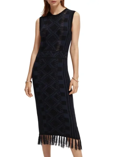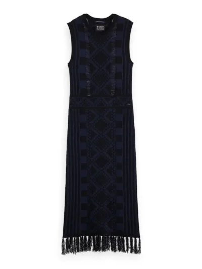 A versatile addition to any wardrobe rotation – this knitted midi dress features an eye-catching all-over motif with stitch detailing at the waist. Easily dressed up or down, we’ve added a fringe detailing at the hem for a polished finish.