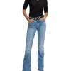 Introducing The Charm, our classic high-waisted flare jeans designed for the modern woman. Crafted from stretch denim, these jeans provide a slim fit at the hips before beautifully flaring out at the calf, creating the illusion of elongated legs. The mid-blue wash, paired with subtle wear detailing, adds a touch of vintage charm, making them a versatile staple for any wardrobe. Featuring a full-length inseam and a convenient zip fly, The Charm combines comfort and style effortlessly, making them the perfect choice for both casual outings and special occasions.