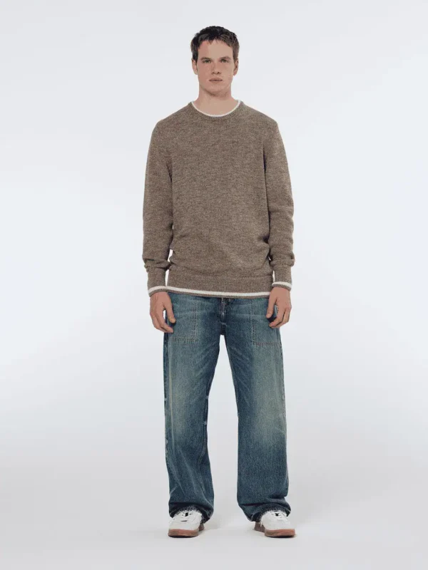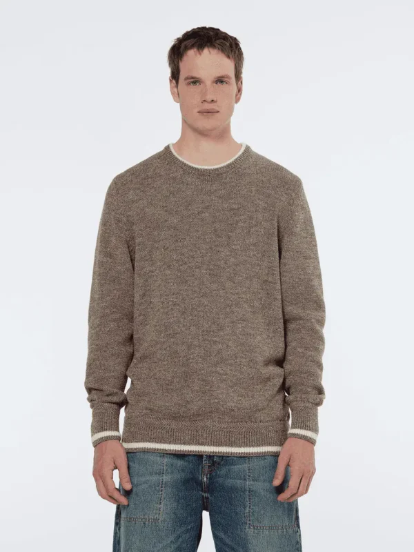 This long sleeved knitwear features a melange fabric that adds a depth and character to the classic crewneck design. Detailed with rib knit cuffs and bottom, and a subtle stripe detail along the collar, bottom and sleeves. It’s a timeless piece for any occasion.