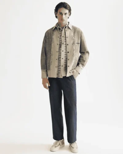 This placement graphic overshirt adds depth and contrast, ensuring you stand out while maintaining a polished look. Layer it over a plain tee or wear it buttoned up for varied styling options. Its neutral tone pairs effortlessly with jeans, chinos, or tailored pants, making it a staple addition to your wardrobe.