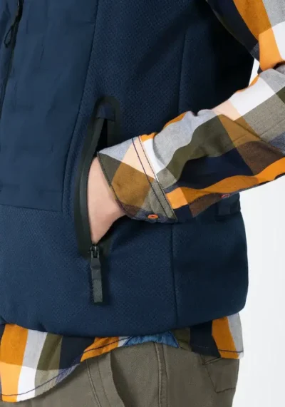 The ultra-light, high-performance quilted vest is made from a material mix. Model made of waterproof and windproof quality and breathable padding with high heat retention capacity. Style upgrade: The chambers are bonded and not stitched and thus offer a completely new, modern look. Waistcoat with stand-up collar, softshell details, waterproof functional zips, and chin guard. Elastic: The armholes and the hem. Inside view: Contrasting lining and zip pocket.