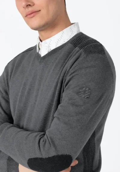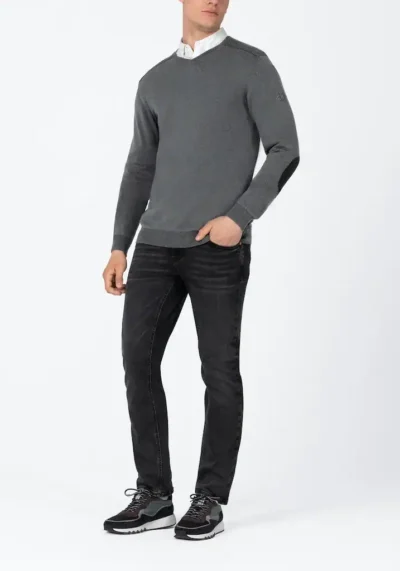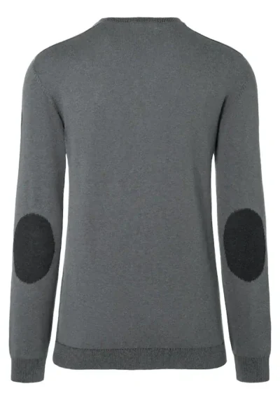 The finely knitted V-neck jumper is made from a super-soft cotton-viscose blend. Rib knit details at collar, shoulders, and side seam. Noble: With a fully fashioned finish on the armhole. Special feature: the knitted-in elbow patch, partly in a contrasting color, using the intarsia technique. Stylish: Either combine a white t-shirt underneath or a light shirt with a checked pattern. Ideal sweater type for office and leisure.