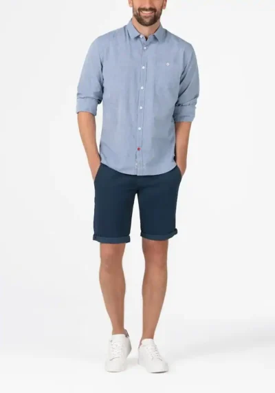 By far the trendiest shorts are made from a high-quality, slightly stretchy cotton-linen mix, and have a comfortable slim fit with a medium rise, two slanted pockets with AMF stitching, and two narrow, buttoned piped back pockets. Waistband processing with overlap solution and rolled-up trouser legs.