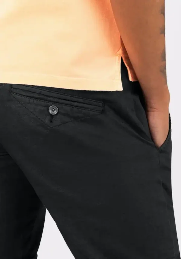 - Slanted, buttoned piped pockets at the back