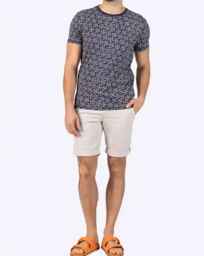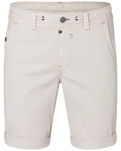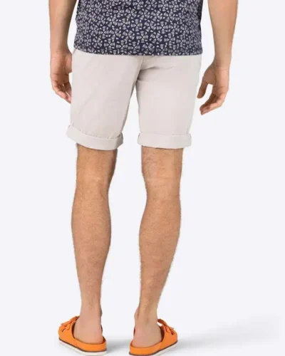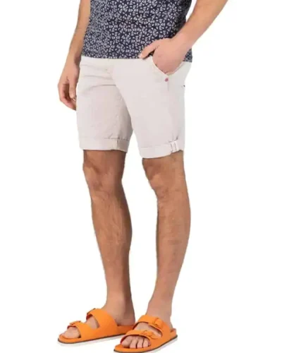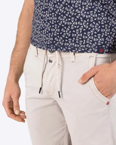 With a sporty twist and a clean design: these summery casual shorts are lightweight in a twill stretch fabric. They feature a masculine slim fit with a mid-rise waist and loosely turned-up legs. They feature a drawstring waistband, welted side pockets, welted back pockets with decorative buttonholes, and a side coin pocket with a snap closure. The exclusive garment-dye and wash process ensures vintage coolness. Still the best combination: shorts and a polo shirt or T-shirt.