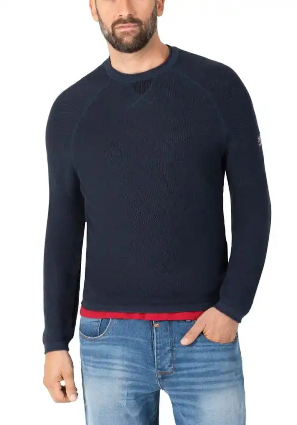 The cleanly designed, light knitted sweater for every occasion. Model made from a high-quality, super-soft cotton-viscose mix with a casual honeycomb structure. Classic regular fit with sporty raglan sleeves. The sweater comes with rolled edges at the round neckline, the cuffs and the hem. Inspired by the sweatshirt: the triangle detail on the front neckline.