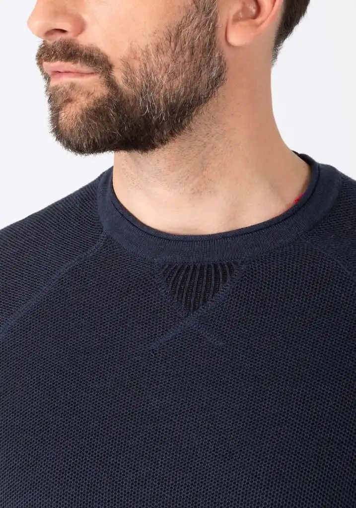The cleanly designed, light knitted sweater for every occasion. Model made from a high-quality, super-soft cotton-viscose mix with a casual honeycomb structure. Classic regular fit with sporty raglan sleeves. The sweater comes with rolled edges at the round neckline, the cuffs and the hem. Inspired by the sweatshirt: the triangle detail on the front neckline.