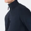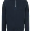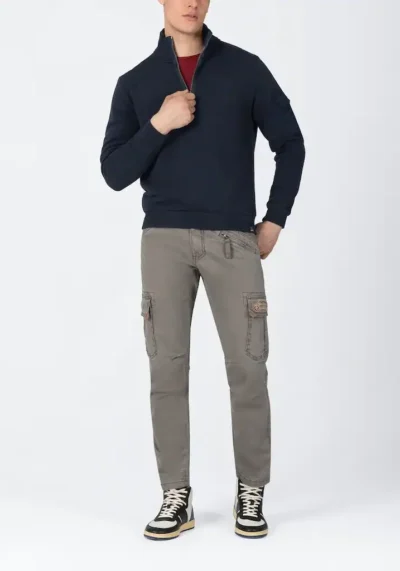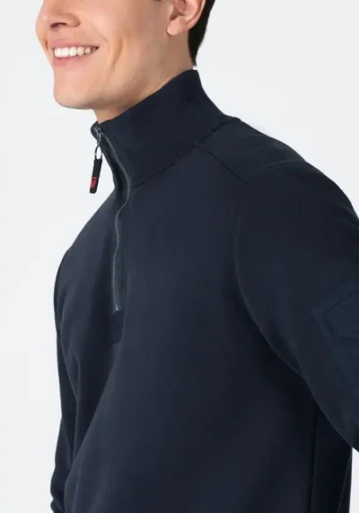 More modern than the retro version, in higher quality and with new update details. The cool piece is made from a soft, brushed cotton mix quality with a robust, soft terrycloth inside and has a high stand-up collar, the classic half zipper, and ribbed cuffs and hem. New: The multiple stitched shoulders and the attached sleeve pocket are made of light cotton twill.
