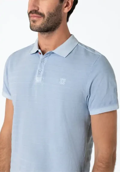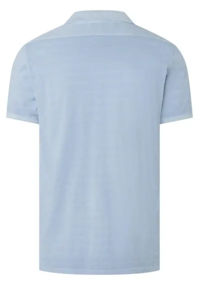 The focus here is clearly on the material. The interesting jacquard piqué jersey has an elaborate, tonal striped pattern and a casual color wash with a garment dye effect. This style with a short, narrow button placket, matching logo embroidery on the chest, narrow shoulder yoke and casually slit side seams.